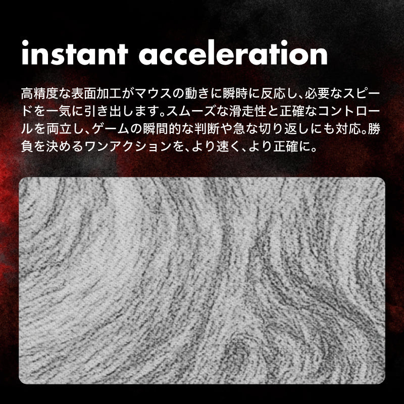 スピードタイプとコントロールタイプ、それぞれの長所をバランスよく融合させたハイブリッド仕様のゲーミングマウスパッド。 軽やかな滑り出しと、狙った位置でしっかり止まる制動感を両立。表面には適度な摩擦感を持たせ、精密なトラッキングにも対応します。