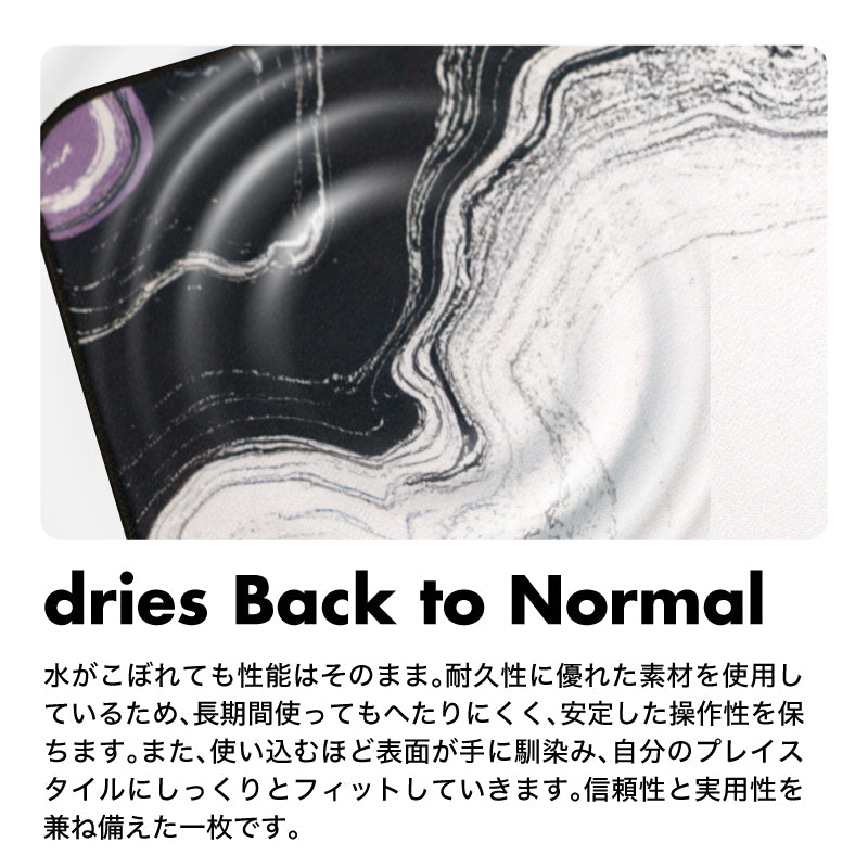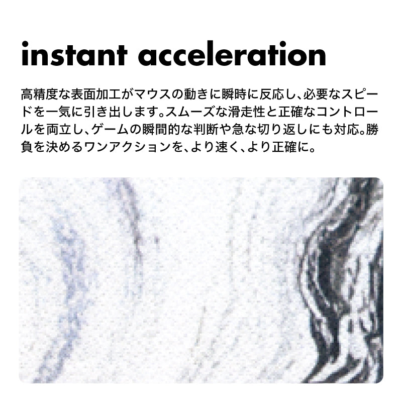 スピードタイプとコントロールタイプ、それぞれの長所をバランスよく融合させたハイブリッド仕様のゲーミングマウスパッド。 軽やかな滑り出しと、狙った位置でしっかり止まる制動感を両立。表面には適度な摩擦感を持たせ、精密なトラッキングにも対応します。